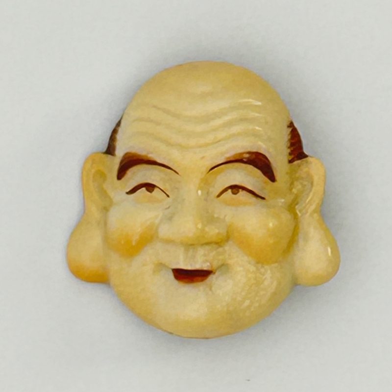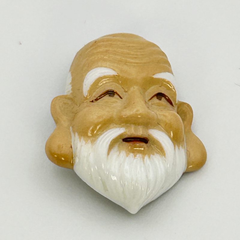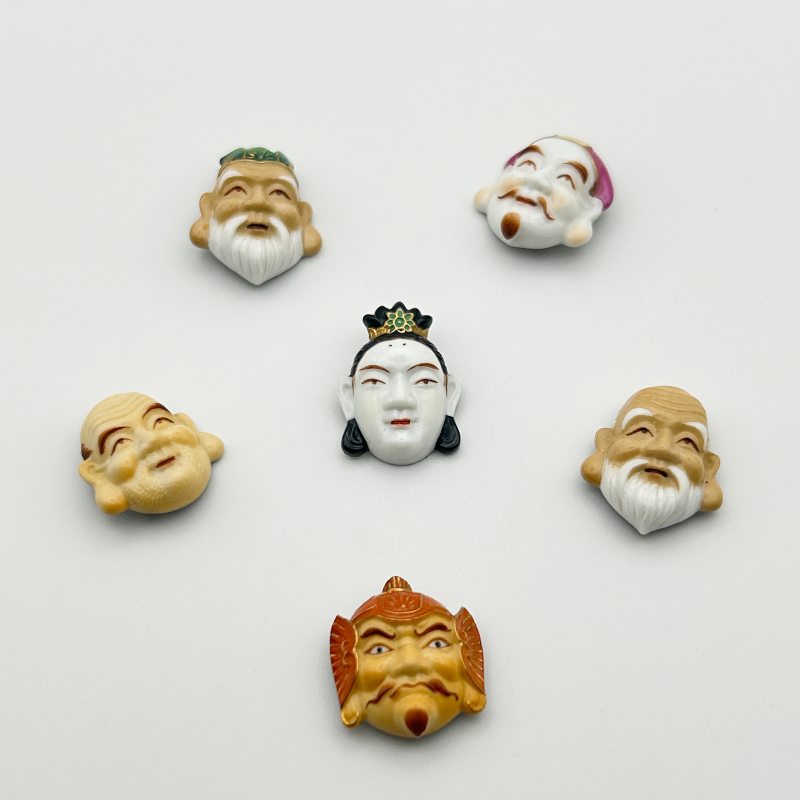 Raro conjunto de seis botones de porcelana japonesa Toshikane, representando dioses emblemáticos de la buena fortuna nipona, esmaltados y decorados a mano para coleccionistas exigentes.
