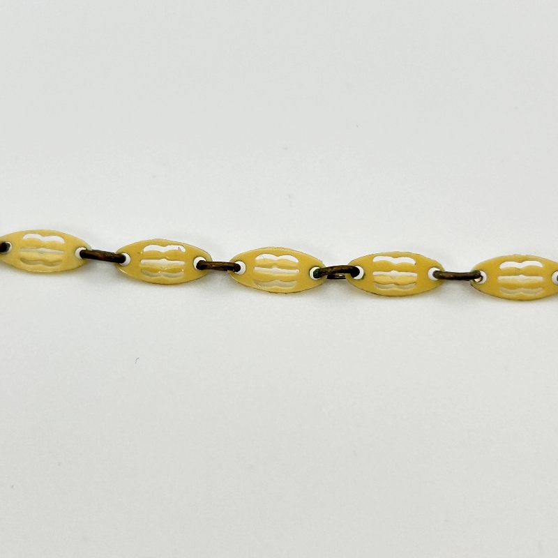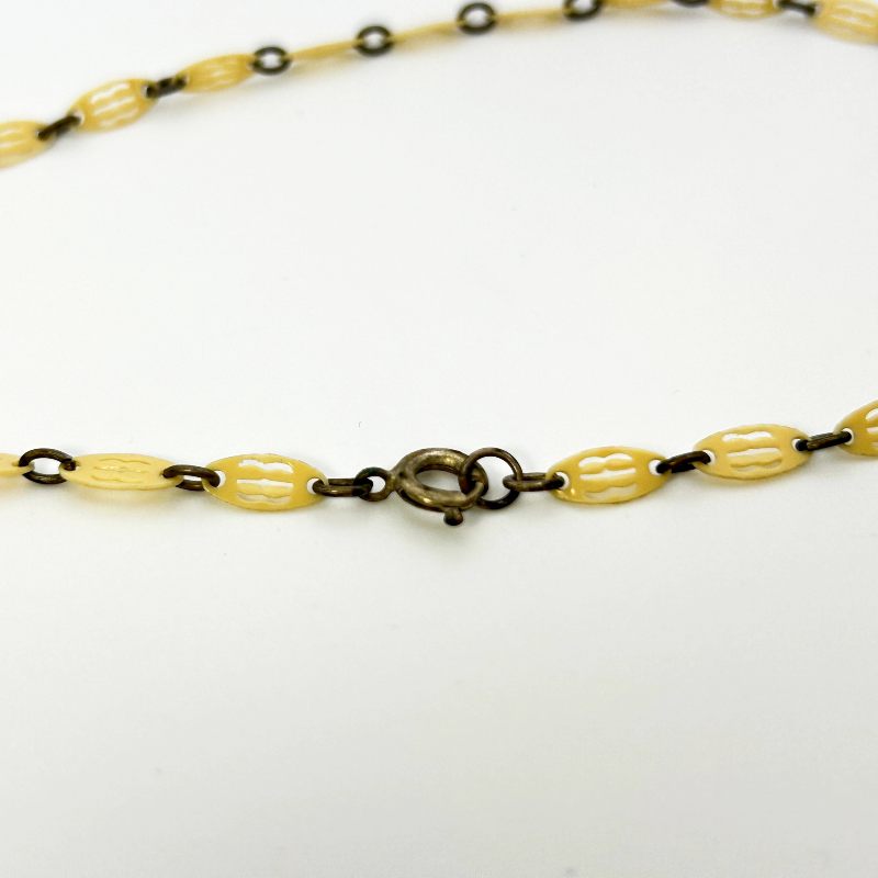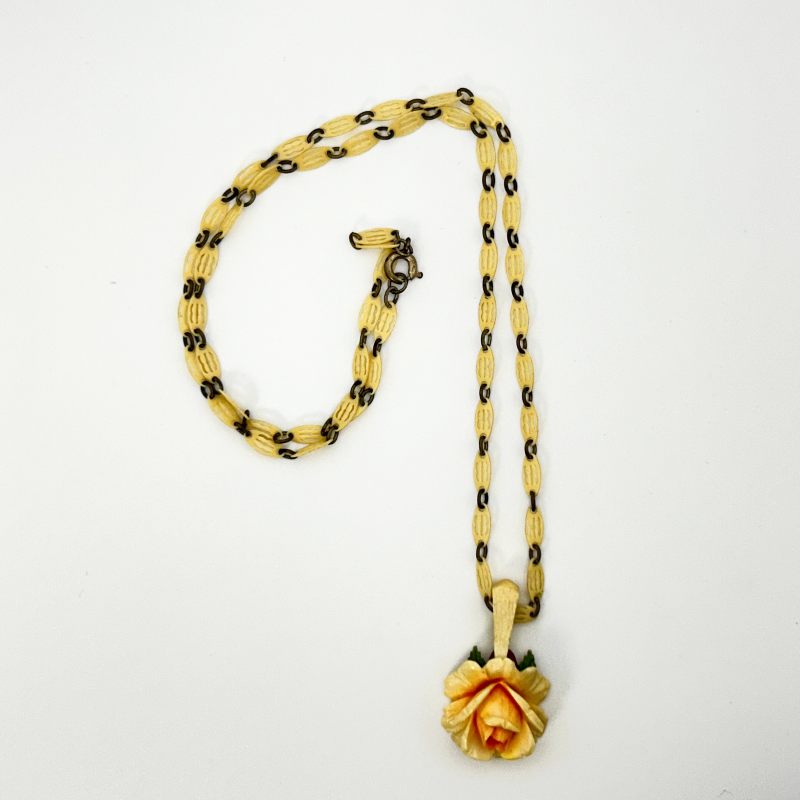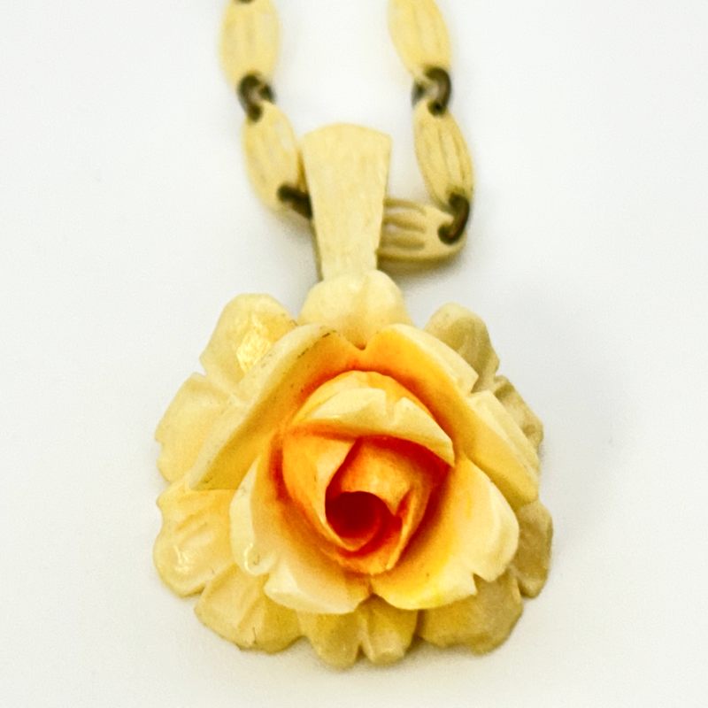 Descubre este collar vintage único, elaborado en hueso tallado con eslabones decorativos y un delicado colgante en forma de rosa pintada a mano, ideal para los amantes de la joyería artesanal y atemporal.