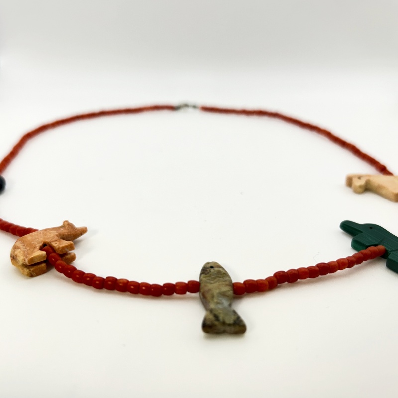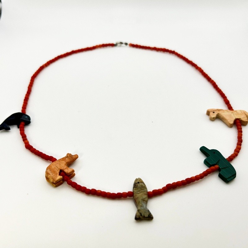 Collar indio americano artesanal de cuentas de coral rojo con colgantes tallados a mano por nativos americanos.