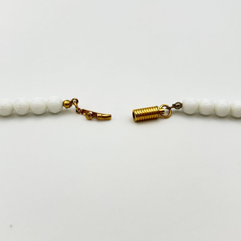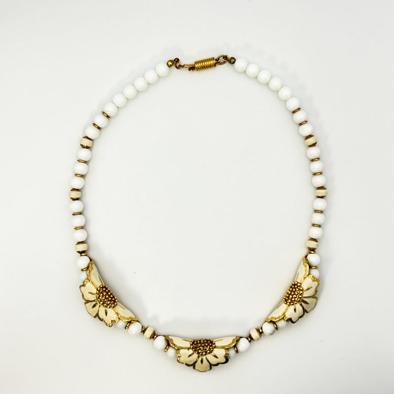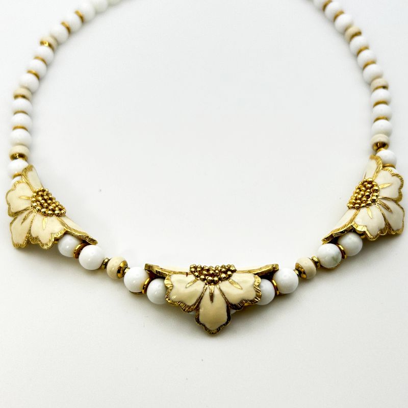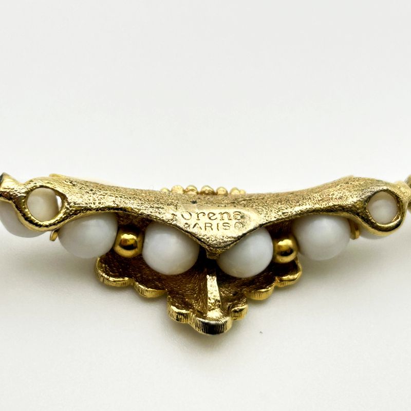 Elegante collar vintage de la marca Orena Paris, con diseño floral en metal dorado y esmalte blanco, acompañado de cuentas decorativas. Una pieza única de los años 80 que combina sofisticación y estilo retro.
