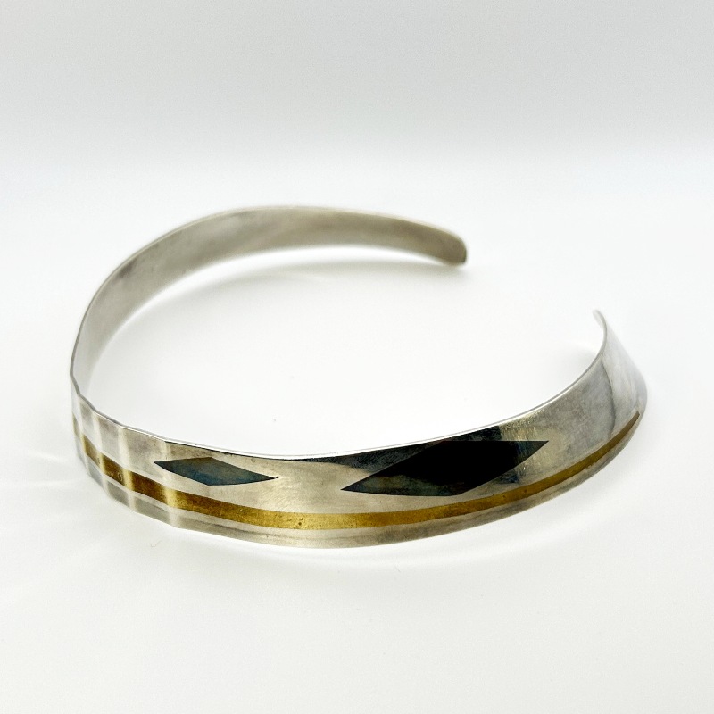 Este collar de plata de Victor Caparrós destaca por su diseño contemporáneo y minimalista, con líneas limpias y un acabado pulido que realza la elegancia de la plata. El choker incorpora detalles geométricos en tonos dorados y oscuros, que aportan un contraste sofisticado y moderno. Su estructura abierta asegura un ajuste cómodo, adaptándose perfectamente al cuello.