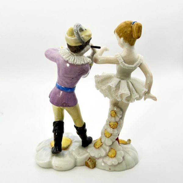 Esta figura de porcelana, creada en los años 50 por Amparo Amador, es una variación del modelo ITEM#01000107.06 y representa a una pareja de bailarines en una escena llena de lirismo y delicadeza. La bailarina, con un tutú decorado con la técnica del tul de porcelana, y su acompañante, vestido con un atuendo renacentista, evocan la elegancia y el romanticismo característicos de las primeras creaciones de Lladró.